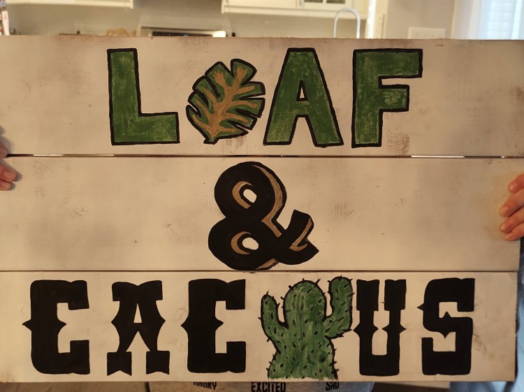 Here, I’ve painted a sign for our back yard to go under a cactus shaped light and some banana leaves wall art. It’s rough and ready – just the way I like it!
