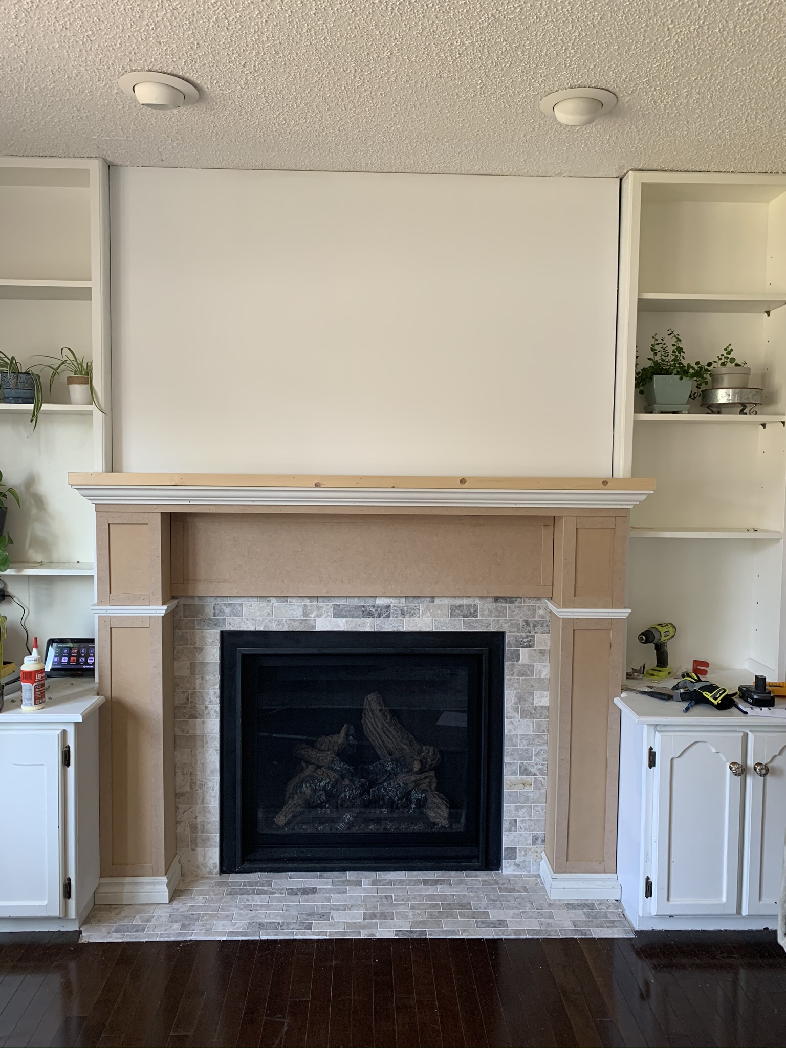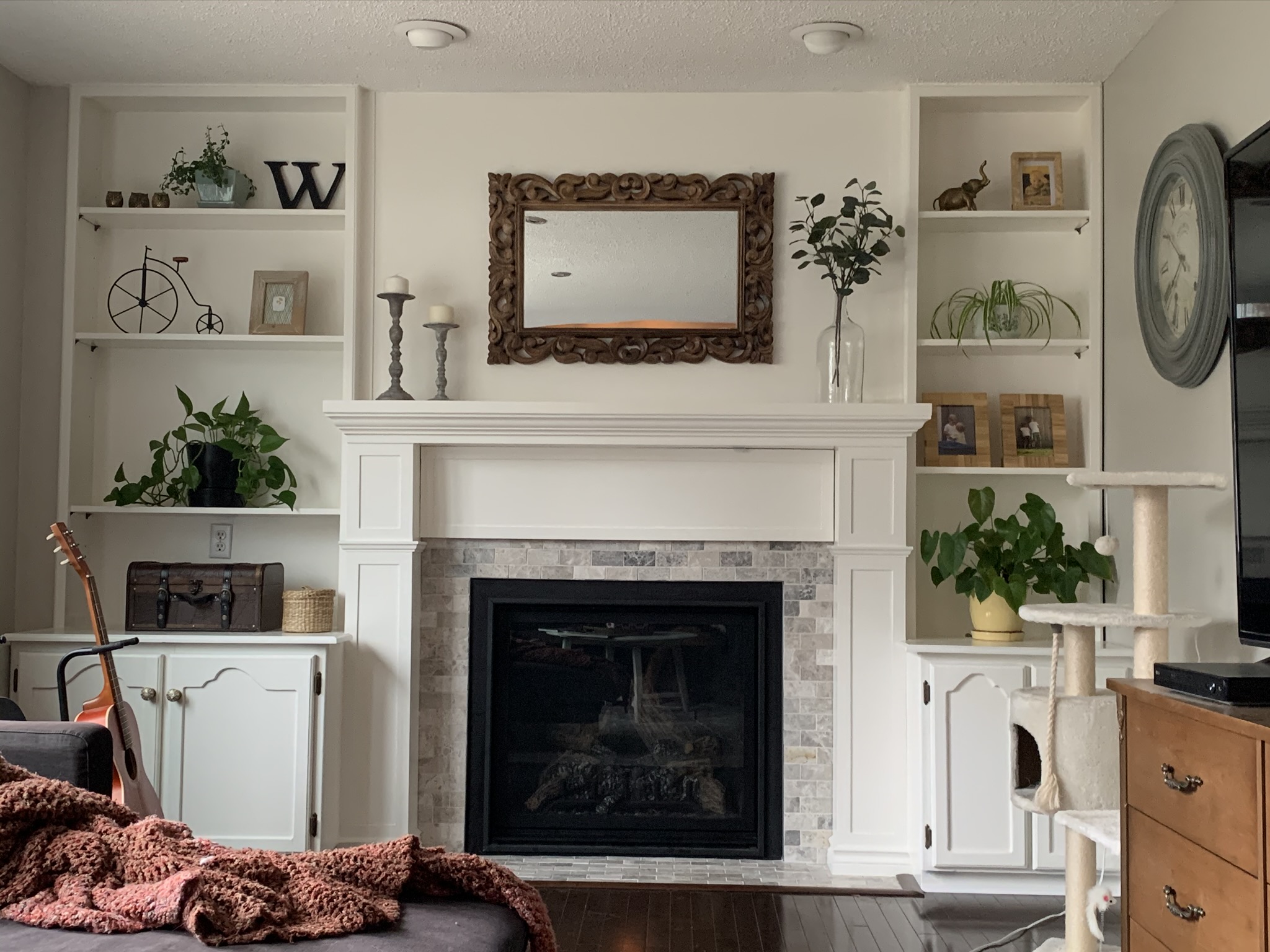 She also made a fireplace surround (made it!) out of necessity because of an obtrusive switch, essential but bloody ugly which would have marred the aesthetic. With a problem like this, I wouldn’t know where to start but Erin did. And this is what I like about her – she didn’t want to settle for the switch being on show even though the installer said that it could not go anywhere else. With the built-ins either side, the switch had to stay or the built-ins had to go. This was not an option and so she thought about the problem and came up with a solution to accommodate the switch as well as creating a beautiful focal point for the room. You simply lift up a disguising panel in the fireplace and there the switch is.