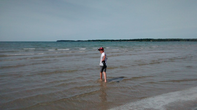 We decided to explore a little and have a stroll up the beach. Despite the copious amounts of other Ontarians on the beach and a few Quebecers too, I’ll wager, whose presence required our path to meander a little to avoid collisions, it was bliss. We dodged the castles with moats, all with an optimistic channel winding to the lake; the toddlers with buckets of water determinedly trying to fill the hole they’d dug next to their parents’ towels; the people walking their dogs and chatting to other dog lovers. We ambled, taking our time, the boys and my husband choosing the shallow water to paddle in.