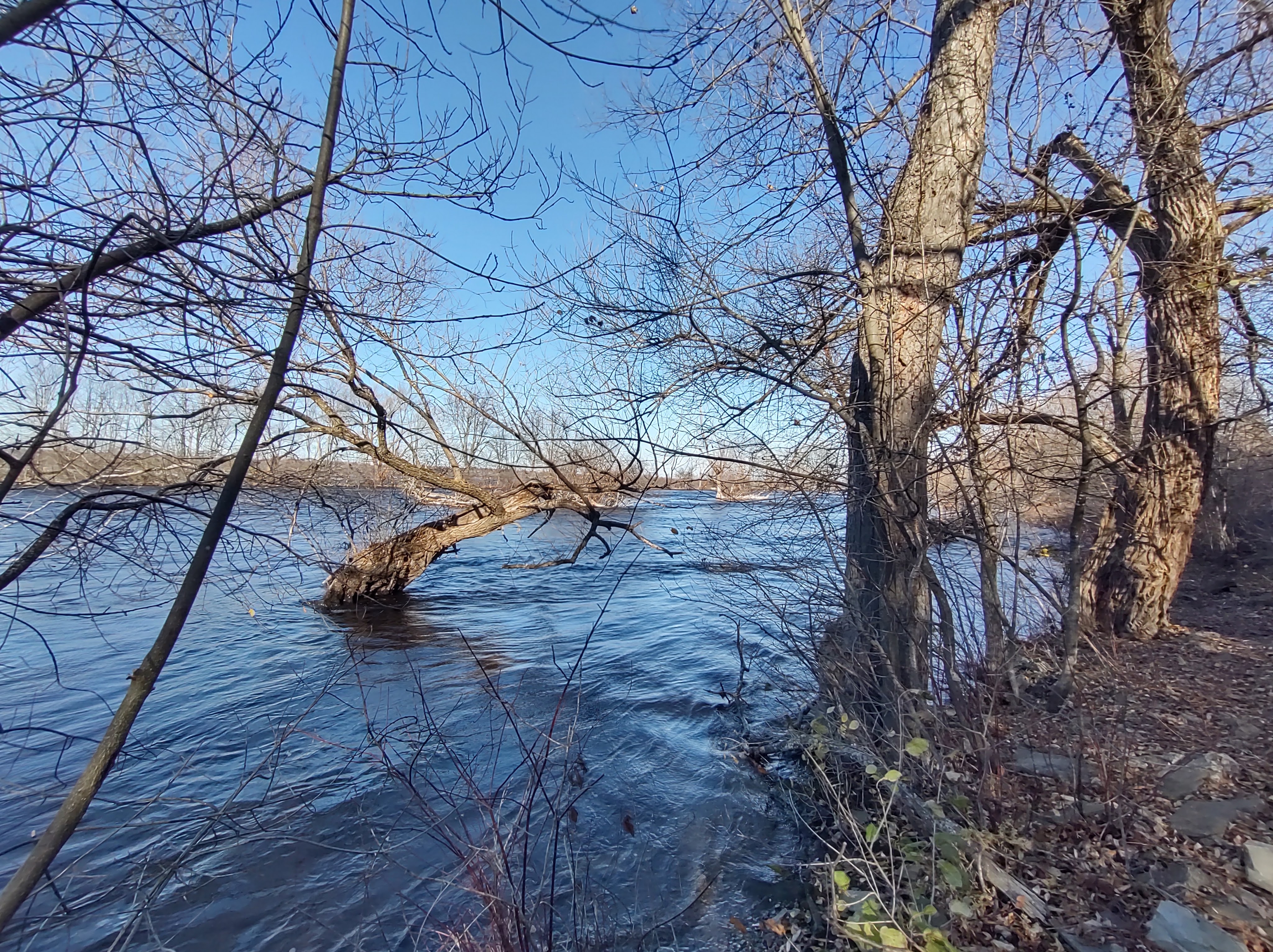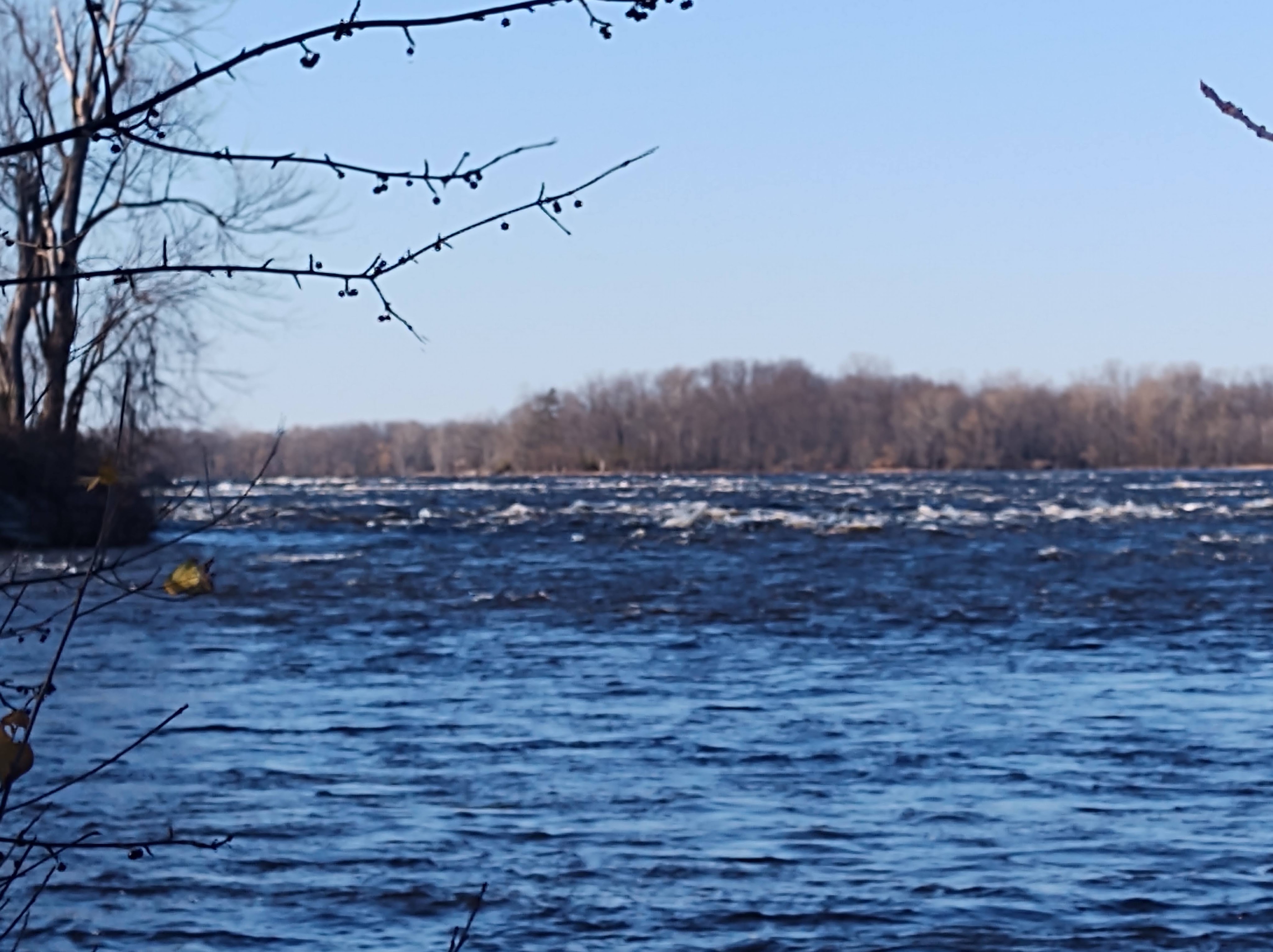 There were a few smaller trails branching off and we could distinctly hear the sound of rushing water – it was only sensible to investigate. Dirt gave way to boulders and with a short scramble down, we found ourselves right next to the Ottawa River and in the distance, the Deschênes Rapids. The water looked pretty rough and we stood there a while to marvel at it and look at the view up and down the river through the precariously leaning trees.