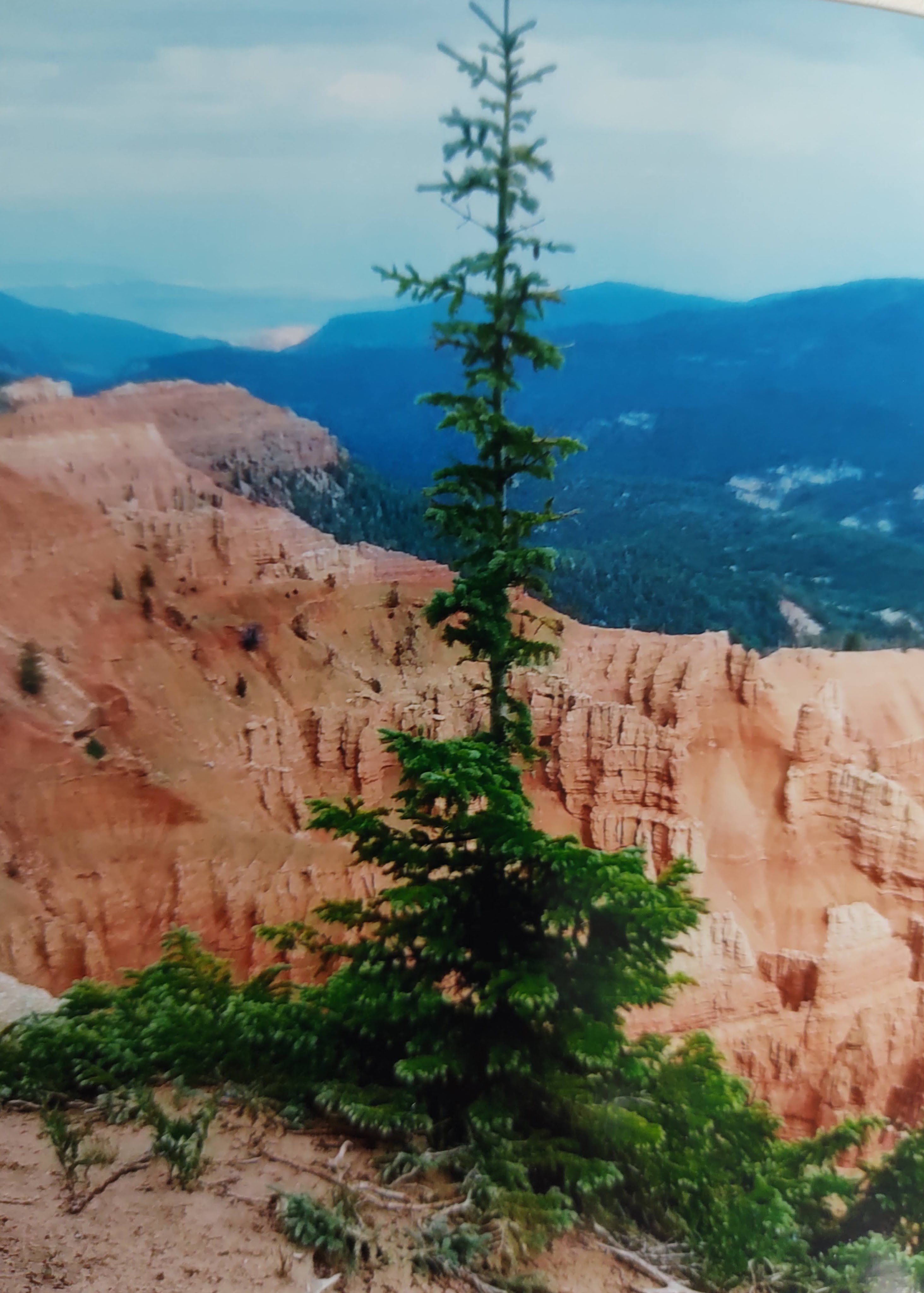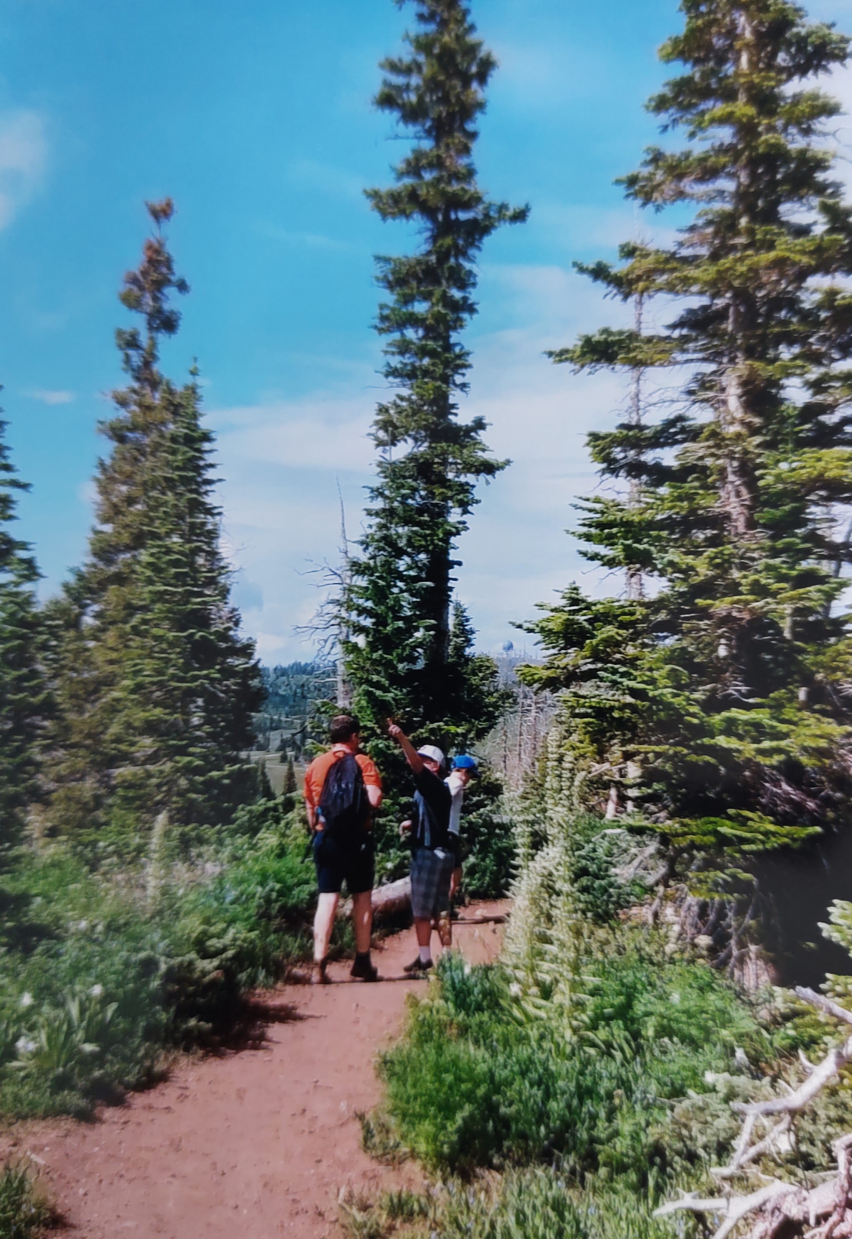 In fact, once the initial part of the walk was passed, the trail became much less boggy and easier to negotiate. Whilst a wider view of Cedar Breaks was our goal, which we were hoping would be best at “Point Supreme”, a logical assumption, there was much beauty to see on the way: the most amazing twisted trees with wild columbines in the greenery adjacent to their roots; pine cones which suggested the tropics in their colourfulness; strange shapes in the ground, possibly termites but looking like the burial mound of a giant spider.