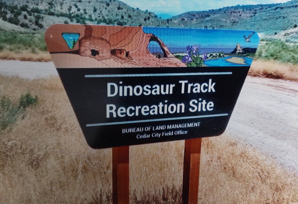 There was a trail winding through rocks and we diligently followed it, through boulders in what was now blisteringly hot sun. It was less of a walk matching human foot to dinosaur footprint and more a hunt for the actual dinosaur footprint next to the post that had been placed to indicate its proximity. We managed to find two, one of which is “shown” in a very indistinct photo below, hence arrow to help, but there was one that we just couldn’t find, even with the post which may well have been put directly on top of it. I do wonder if they are only visible in a certain light or it even crossed my mind that a practical joker in the Bureau of Land Management had put a random one in to test our powers of observation and our integrity. Whatever the truth, there was one that definitely got the better of us that day.