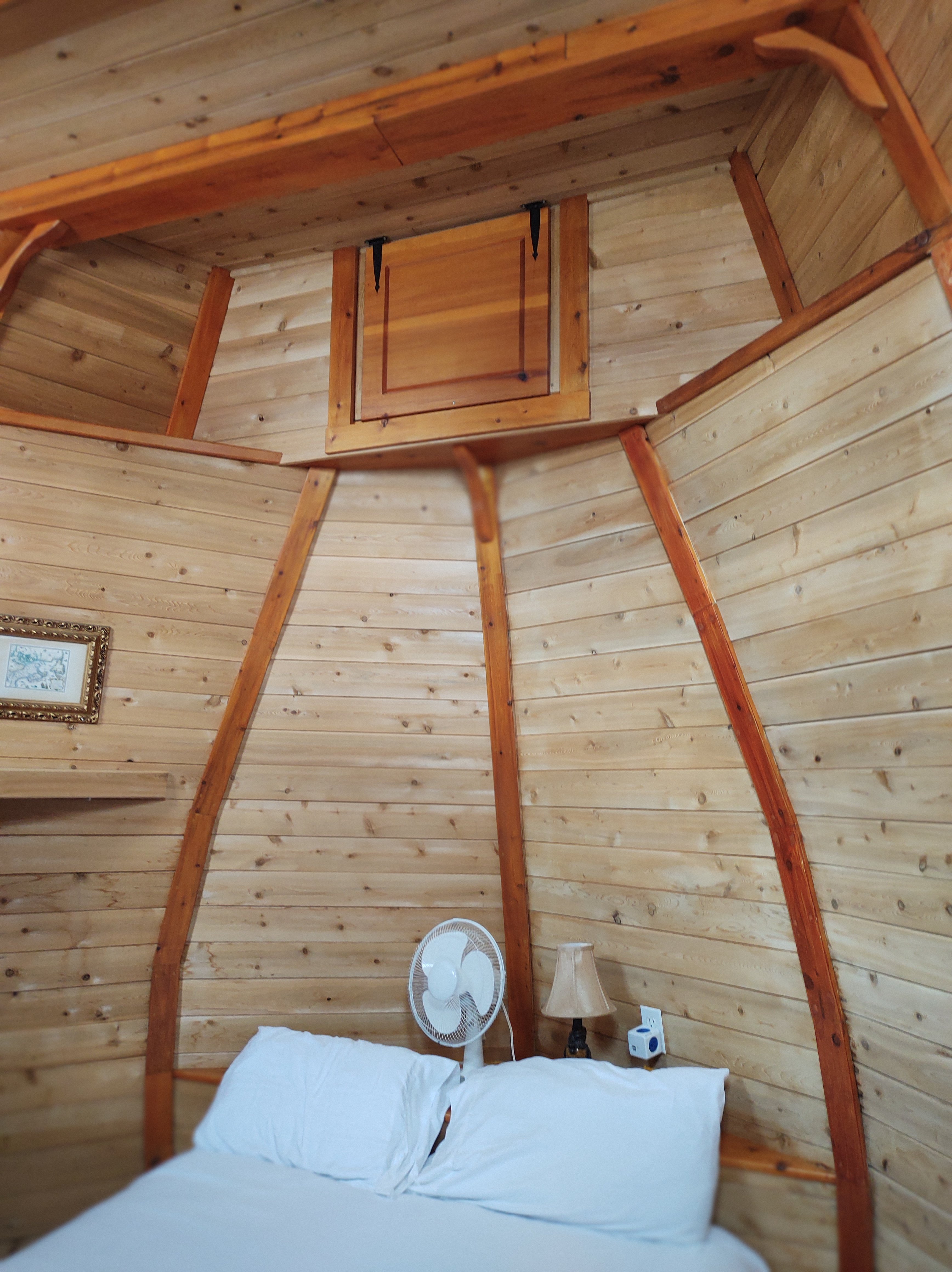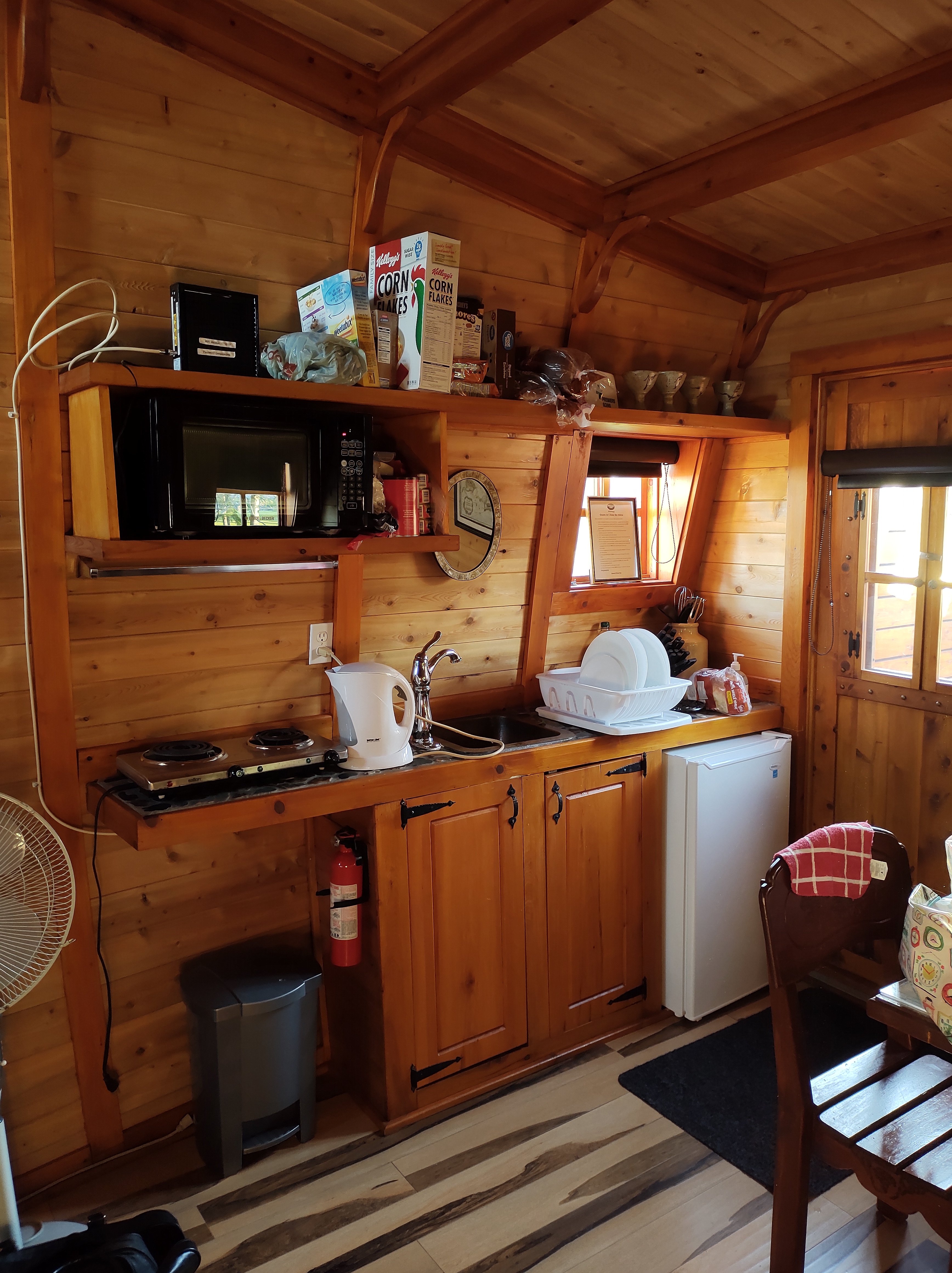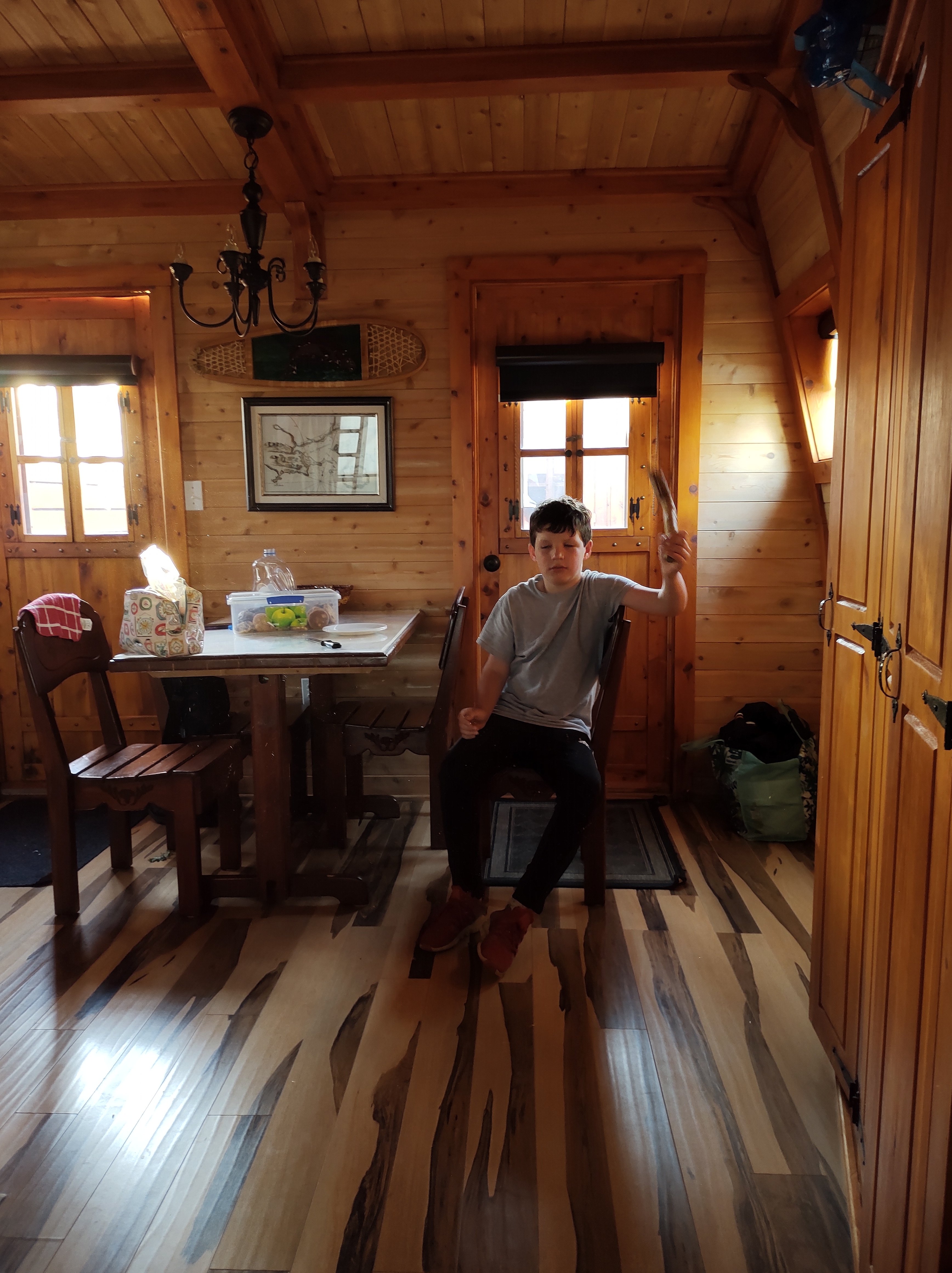 The chalets were easy to find at the side of the road, just outside a village called Maria, which was just as well, as we had had a daunting 10 hour drive to get there and we were weary travellers when we pitched up, despite the frequent Tim Hortons’ stops and the scenery. The other chalets were pedestrian compared to our majestic vessel; their normal shape of boxy squareness with a pitched roof might look just the thing on the side of a Swiss alp or in a wooded clearing in a Canadian park but here, they were eclipsed completely by our ship.