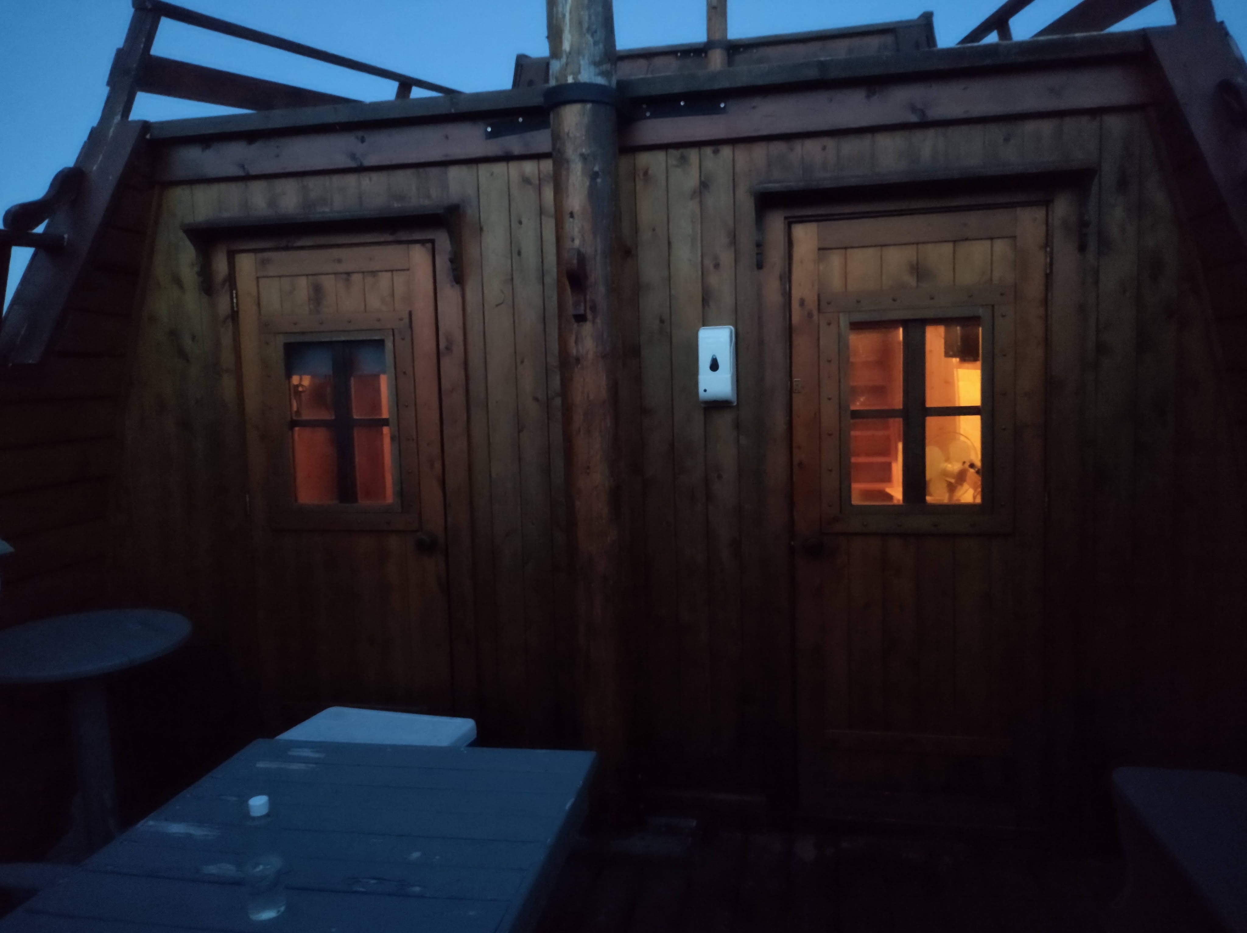 It didn’t disappoint. The boat was split into three sections: there was an outside seating area in the middle of the ship, where you gained entry to it and the other parts; at the rear of the ship (is that the bow or the stern? I don’t know!) was the first double room up a short set of stairs, with views onto the Baie de Chaleur, accessed from the galley kitchen and seating area. There was also a table with four chairs in case of inclement weather conditions.